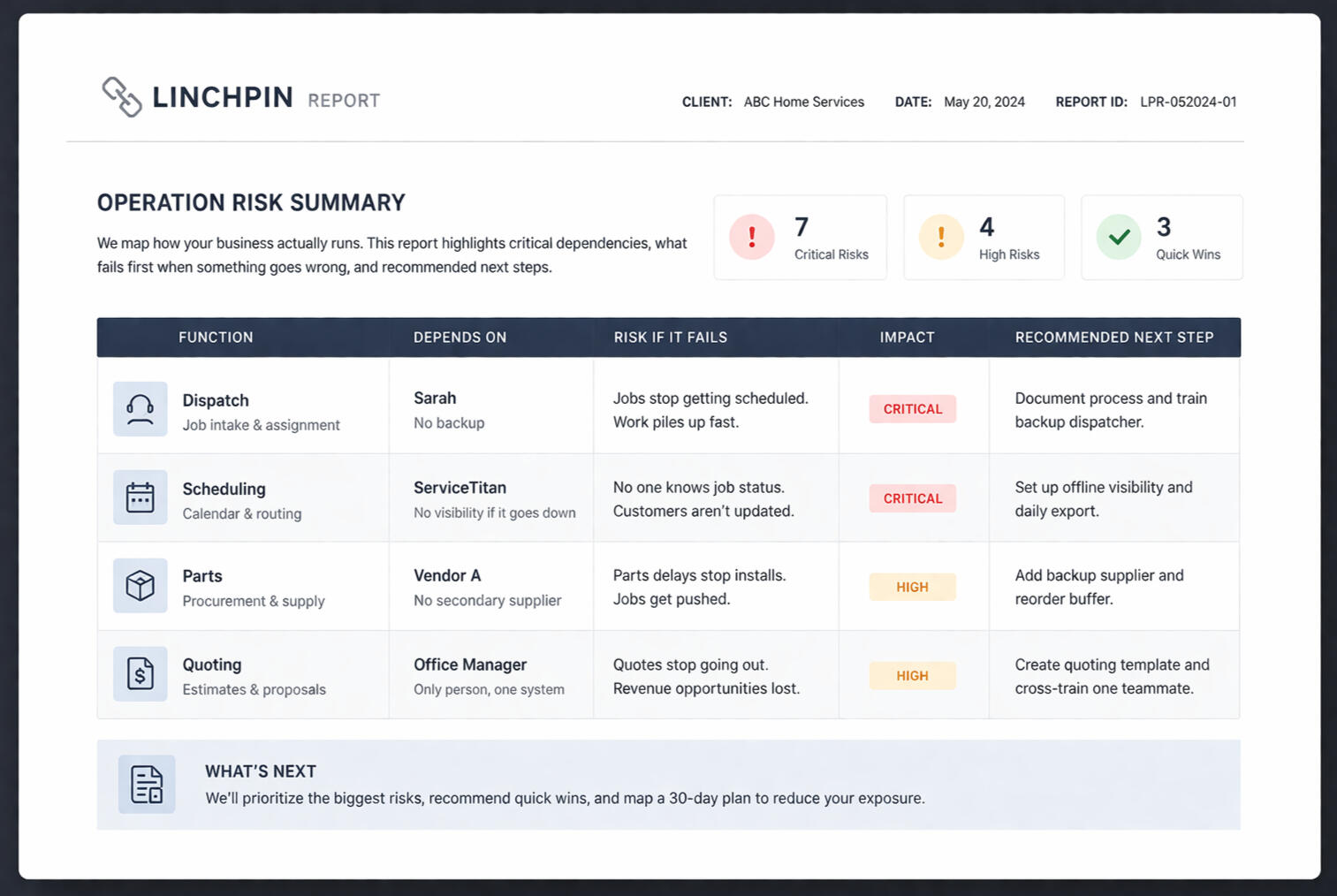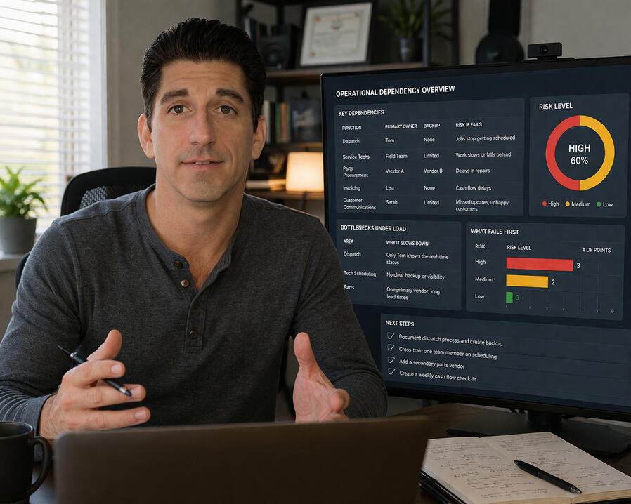We start with a real conversation. You walk me through how things actually run day to day the good, the messy, everything in between.Who handles dispatch. Who knows the scheduling software. How jobs get quoted. What happens when something goes wrong.I map where your operation depends on one person, one system, or one vendor.You get a clear report showing what breaks first and what to fix.We go through it together so you leave knowing exactly what to do next.